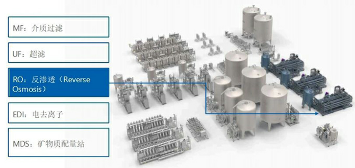 RO (反滲透): 利用高壓作用通過(guò)反滲透膜分離出水中的無(wú)機(jī)鹽,最終達(dá)到脫鹽的目的,同時(shí)去除有機(jī)污染物和細(xì)菌,截留水污染物。